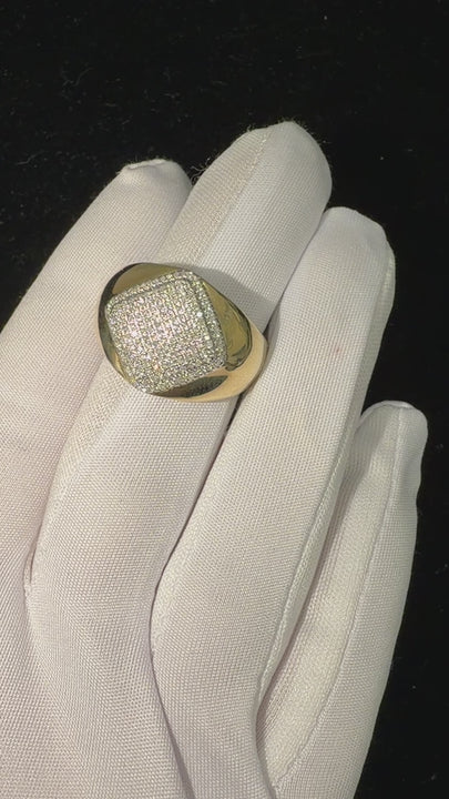 A sophisticated yellow gold signet-style ring featuring a raised cushion-shaped platform. The center is meticulously pave-set with numerous round brilliant-cut diamonds, creating a shimmering geometric focal point. The bold, wide shank showcases a high-polish finish, contrasting elegantly with the concentrated brilliance of the diamond cluster.