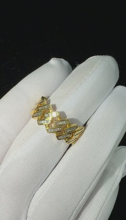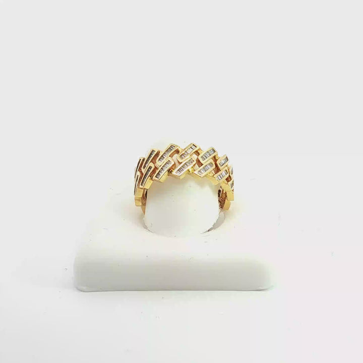An elegant yellow gold band ring featuring a sophisticated row of baguette-cut diamonds. Each diamond is expertly set in a precision channel, showcasing a step-cut style that emphasizes exceptional clarity and internal transparency. The polished yellow gold composition provides a warm, luxurious contrast to the colorless brilliance of the diamonds. This refined arrangement offers a seamless, linear aesthetic with superior symmetry, making it an ideal choice for a wedding band or a stackable luxury accessory.