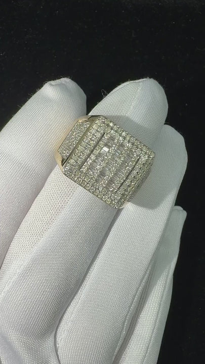 An exquisite yellow gold signet ring featuring a centrally mounted baguette cut diamond. The diamond displays exceptional transparency and a precise step cutting style, set flush within a polished rectangular head. The band exhibits a wide, smooth profile with high polish symmetry, tapering elegantly for a comfortable fit. This composition blends traditional signet architecture with modern minimalism, showcasing a singular, brilliant diamond as a sophisticated focal point.