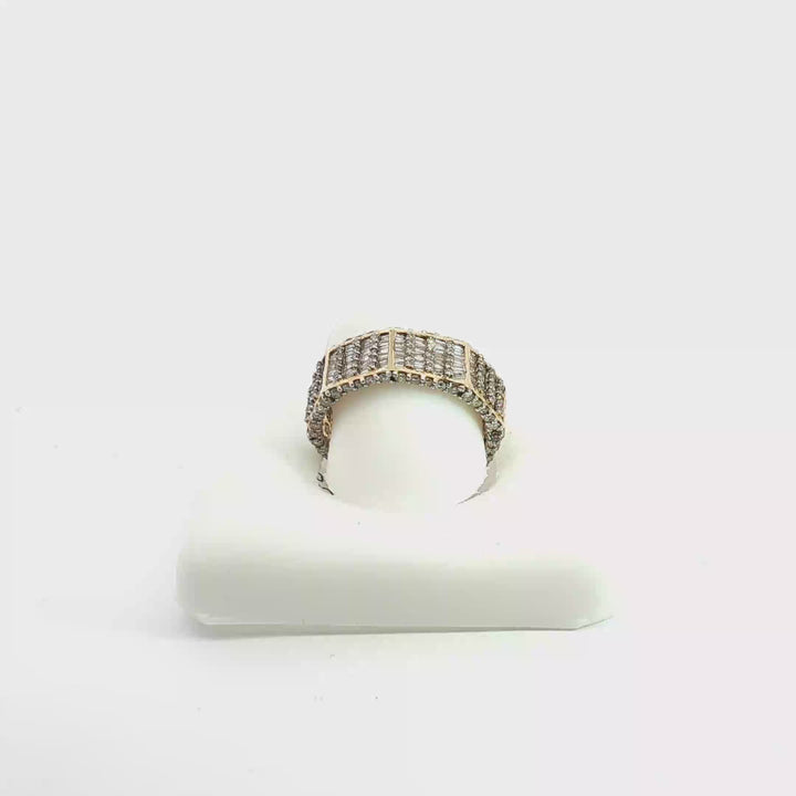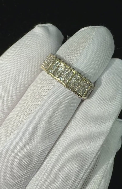 An exquisite yellow gold band ring featuring a contemporary geometric design. The piece is accented by a series of rectangular baguette-cut diamonds, meticulously set in a flush channel arrangement. These diamonds exhibit exceptional clarity and a sleek step-cut facet pattern, creating a sophisticated play of light. The high-polish finish enhances the warm luster of the gold, resulting in a seamless and elegant silhouette perfect for stacking or as a refined standalone statement piece.