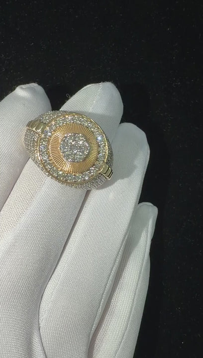 This exquisite rose gold cocktail ring features a mesmerizing circular arrangement of round brilliant-cut diamonds. The center stone is meticulously set to maximize light dispersion, surrounded by concentric halos of micro-pave diamonds that extend down the split-shank band. Each diamond exhibits exceptional color and clarity, harmonizing with the warm tones of the high-polish rose gold setting. A sophisticated composition of light and symmetry, this piece represents the pinnacle of fine jewelry craftsmanship and timeless elegance.
