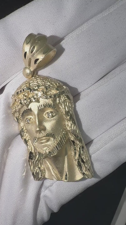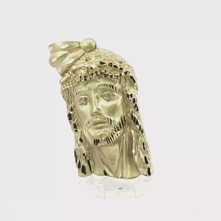 A meticulously detailed Jesus Head pendant crafted in yellow gold, featuring a sophisticated mix of satin and diamond-cut finishes. The eyes are set with two round brilliant-cut diamonds, adding a sharp brilliance to the sculptural design. A wide, textured bail ensures secure suspension while complementing the crown of thorns and beard details.