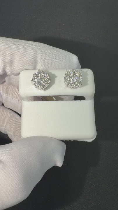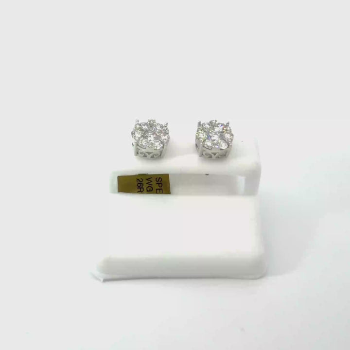 These elegant cluster earrings are expertly crafted in polished white gold, featuring a sophisticated arrangement of round brilliant cut diamonds. Each earring showcases a central diamond surrounded by a halo of smaller diamonds, creating a luminous floral silhouette. The diamonds exhibit exceptional brilliance and symmetry, securely held in fine prong settings. Designed with a front-facing orientation and secure fastenings, these timeless pieces offer a high-clarity sparkle perfect for any formal or bridal occasion.