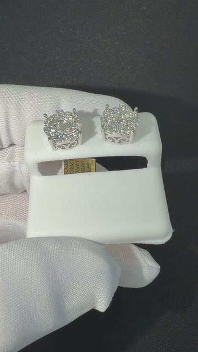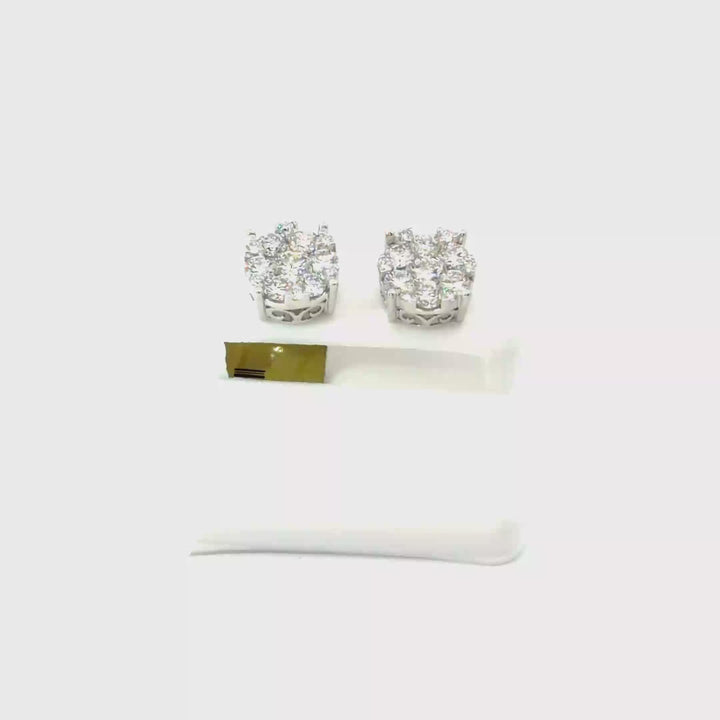 Exquisite white gold cluster earrings featuring a sophisticated floral arrangement. Each earring showcases a central round brilliant cut diamond surrounded by a halo of smaller round diamonds, creating a shimmering petal effect. The diamonds exhibit exceptional clarity and a high polish finish, set in a seamless prong composition that maximizes light return. These elegant studs offer a timeless silhouette with superior symmetry, making them a perfect addition to any fine jewelry collection.