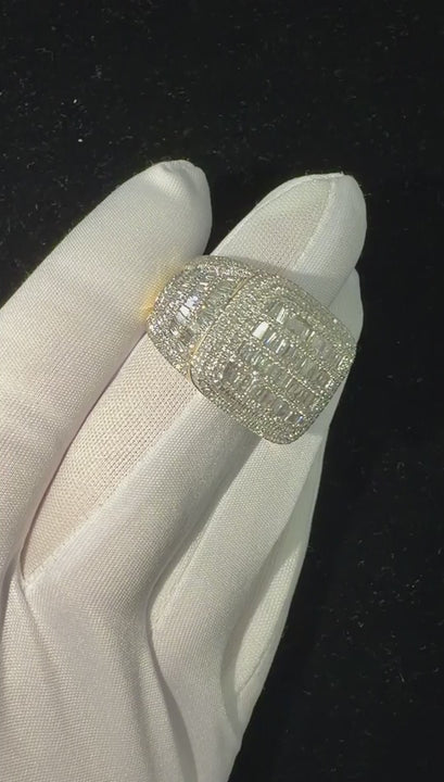 An exquisite 18k yellow gold cocktail ring featuring a striking geometric arrangement of step-cut baguette diamonds. The baguette diamonds are meticulously channel-set in a staggered linear pattern, showcasing exceptional clarity and a brilliant white color grade. The polished yellow gold band provides a warm contrast, enhancing the architectural symmetry and sophisticated composition of this fine jewelry piece. Perfect for those who appreciate modern elegance and precision craftsmanship.