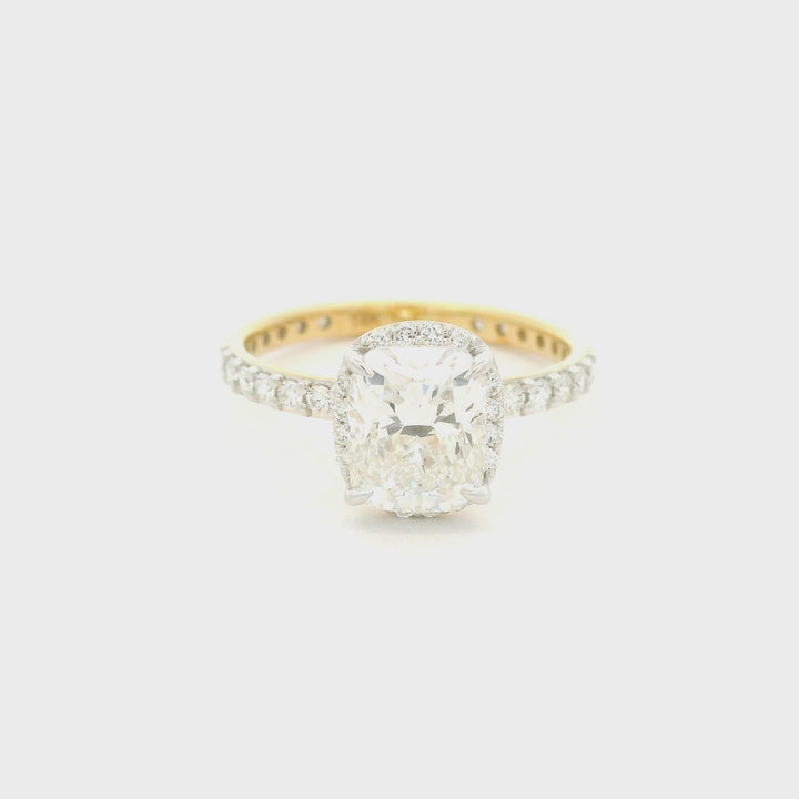 Timeless and radiant, this ring features a beautifully proportioned cushion-cut diamond framed by a delicate halo of round diamonds, creating a luminous centerpiece with exceptional depth and brilliance. The softly contoured shape of the center stone offers a classic yet elegant presence that captures light from every angle.