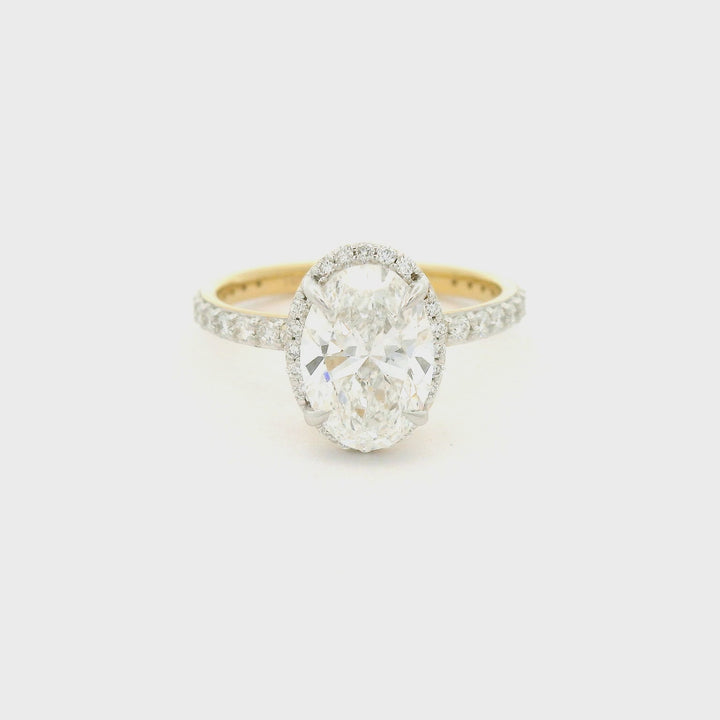 Elegant and captivating, this ring showcases a beautifully cut oval-shaped diamond framed by a delicate halo of round diamonds, creating a radiant centerpiece with enhanced brilliance and depth. The halo gently accentuates the elongated silhouette of the center stone, offering a graceful and timeless appearance.