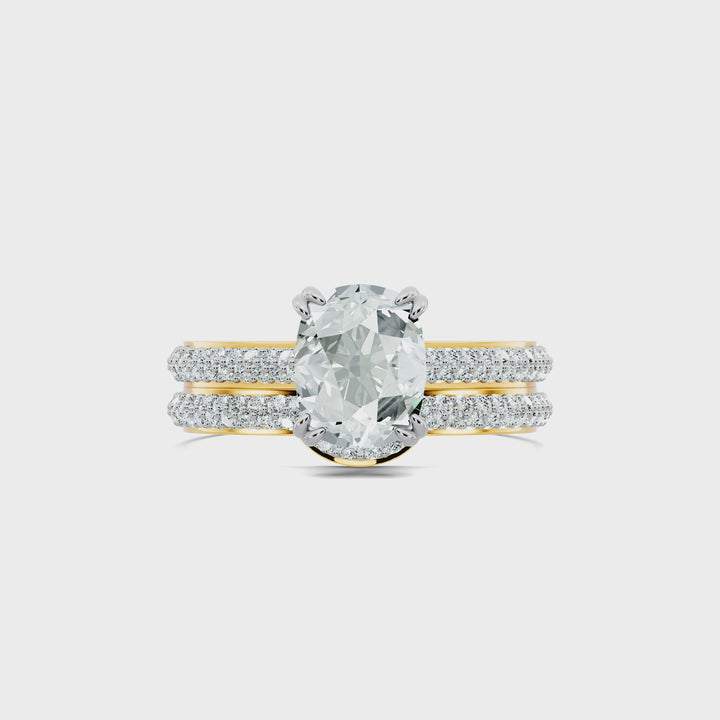 What sets this design apart is its captivating double-band silhouette. Two diamond-accented rows gracefully frame the center, creating a layered effect that adds dimension and elevated luxury. Beneath the center setting, a hidden halo of round diamonds adds an extra touch of sparkle, delivering brilliance even from the side profile.